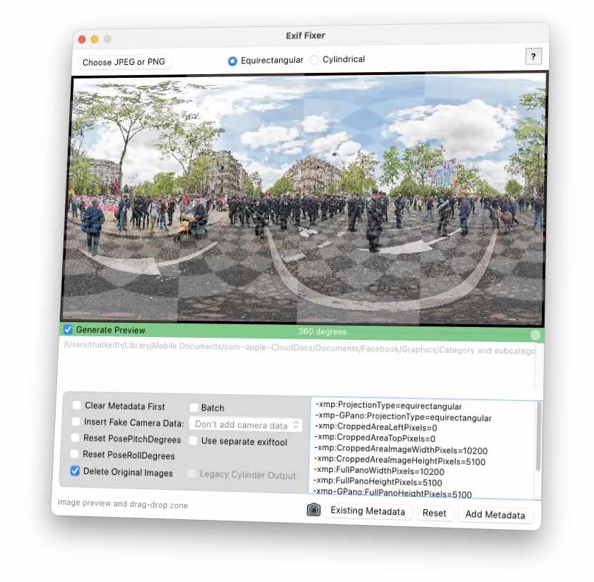 Manually calculating and inserting pixel dimensions, field of view angles, camera models and projection types is a headache. Exif Fixer automates the process for you.